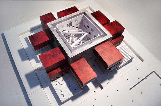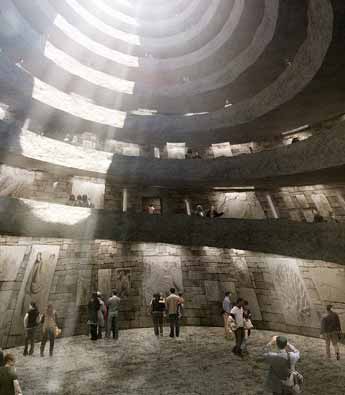 3)光的幻象意境配置:主要侧光源的磨砂白玻使得窗外的景色抽象、窗内的光线涣散,成就一系列光与体的退晕效果;来自屋顶的光则直接明了地倾泻而下,整体的光照方式将人的注意力吸引“向上”高远的光明与希望,两处带色(处红、处黄)的天窗在局部利用光与色的互动给内部空间染上了强烈的色彩,使得室内环境变得鲜亮激昂。