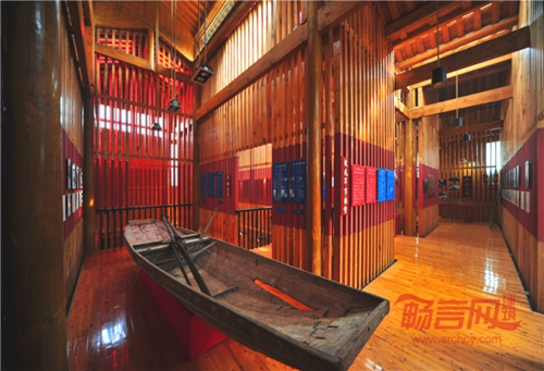 2)密条空间:密条的平行布局,以及条缝的大量通透性,使狭小的陈列空间小中见大, 也使得整体的建筑内部最终达到一种复杂的纯净效果。室内的密集木条景象也象征着当时革命的现实:荆棘密布,但是遮不住希望的远方;由此巧妙通过空间的营造,完成陈列性空间的先天教化心灵的职能。
