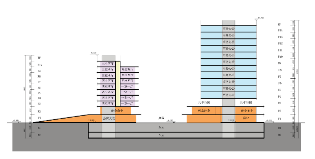 为提升基地内部的连通性,设计采用流线型布局策略,通过底层通廊,构建两个地块间的连接,让访客在地块间畅通漫游;同时通过西侧的下沉广场,与地铁站无缝衔接,激活基地与周边脉络。设计将文化中心置于东侧,与会议展览中心相邻,形成公共服务双核心。西侧地块通过底层商业裙楼无缝连接各功能塔楼,其中公寓塔楼设置在临公园一侧,通过二层的架空花园与公园无缝衔接,营造出静谧的环境与极佳的景观视野;五座办公塔楼沿街依次排布,彼此独立又通过裙楼形成连接,塑造出富有层次的城市天际线。