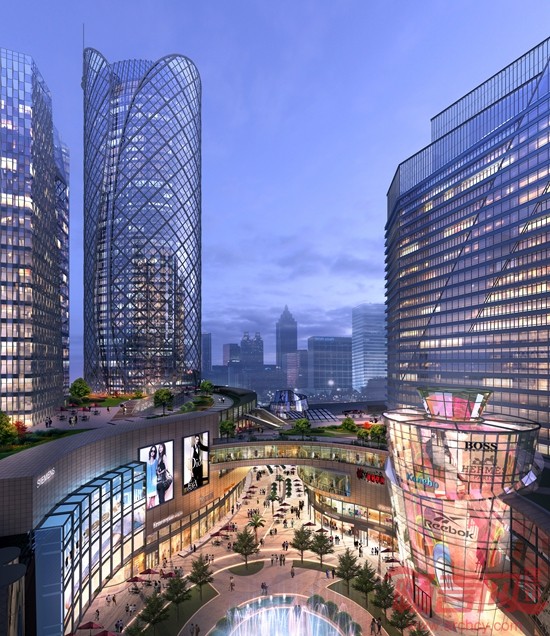 西北角设置一栋超高层作为5A级办公与五星级酒店。其建筑设计以椭圆形平面与立面丝带浑然一体为概念,线条柔美婀娜,高耸挺拔,为广场平添几分气势。超高层主入口以地下立体交通高效分流商业与酒店不同的使用人群。