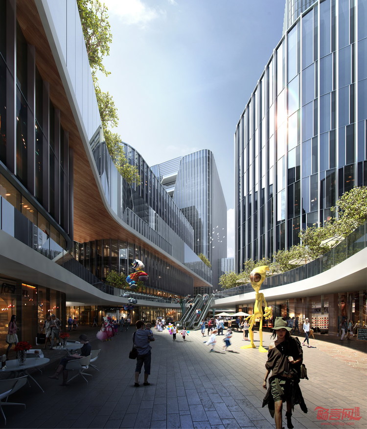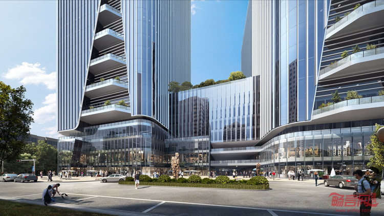 地块西侧是公共景观广场,与此同时,该设计在露天多层商业街融入了丰富的绿植空间和水元素。不同的建筑高度不仅带来强烈的视觉效果和多样的功能平面,还提供了不同高度的空中花园。沿着建筑立面上倾斜凹槽的绿植露台为项目增添更多绿意。