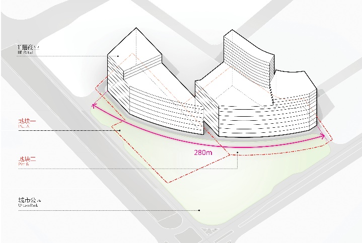 在此基础上将架空层进行错位以过渡上下关系,使局部空间上下渗透,以层层退台和多级路径打造开放的公共空间。面对两地块的分割性难题,设计团队创造性地引入整体大气的屋顶飘带,以一气呵成的形态将两侧地块连接在一起,提供给城市独特的地标形象。屋顶飘带在解决上方体量过碎的同时为市民打造空中观景平台及跑步健身场所,以开放的姿态拥抱这座城市。