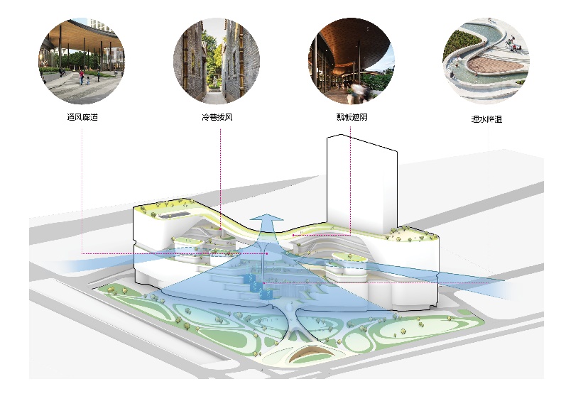 如何适应岭南地区炎热多雨的地域气候性是项目设计的另一重要研究要点。设计通过流畅的屋顶飘带打造“大榕树下”的遮阴效果,也顺应广州夏季风的通风廊道,形成良好的风环境。同时项目借用当地传统建筑开敞空间的营造手法,通过控制建筑尺度,打造巷道空间,从而形成“冷巷拔风”的通风效果;再通过理水降温的理念,与周围绿地公园一体化打造,从而形成舒适宜人的微气候环境。