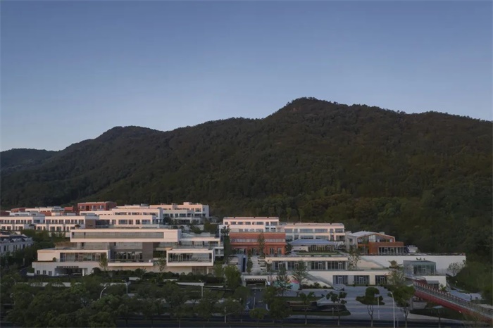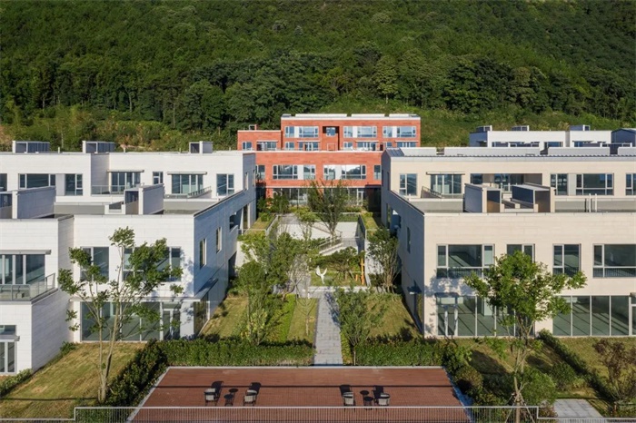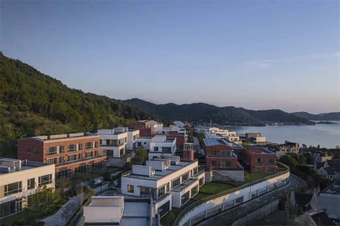 建筑主要材质为石材一体板,外立面石材的纹理和质感与此间自然环境的背景更为融洽。以组团为基础的色彩单元,配以精致的米白色和稳重的淡黄色穿插,同时以村为单位点缀粗粝的红色砂岩组团,增强可识别性。同时为山林中的小镇增添一抹亮色,让这个湖畔的山地聚落在望湖观山的同时,也成为风景本身。