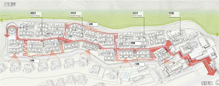 “山线”从小镇入口处开始,顺应山势往上,而后在三村交界处穿行,形成曲折蜿蜒的路径体验,与地形有机结合,打造错落起伏的景观游线;“村线”在茶亭市集处与“山线”重合,迅速消解高差而后在三村之中水平穿行而过,充分结合建筑组团的使用需求形成平缓开敞、高效舒适的办公商线。