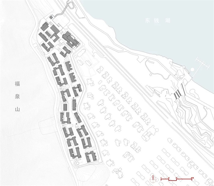 项目为商办用地,位于东钱湖南岸线区域,环湖南路南侧,现状山体福泉山的东侧,周边多为居住用地。地块形状狭长,地势复杂,从环湖南路向西迅速抬升,而后向南转折,缓缓蜿蜒上行。场地西南侧的现有道路,和场地东北角相邻的城市道路之间的高差达到了32m,和东侧相邻已建小区地面高差达18m。