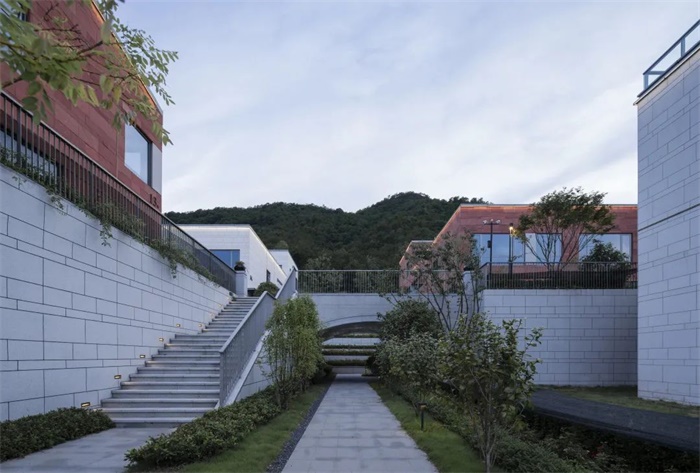 各个组团内建筑体量形成“U”字形围合关系,顺应地势,后排单元比前排高约4m,以确保每个单元都有湖景视野;后排单元的地下一层结合组团花园设有组团共享的公共服务空间,也为组团花园创造了活泼生动的空间氛围;层次丰富的组团建筑形态形成了多层级的露台关系,和山地地形带来的台地形态相呼应,同时相邻组团之间也在不同层面将庭院打通,起承转合,层层递进,空间具有极强的进深感。建筑在这里成为场地的一部分,一同融入这山水之间。