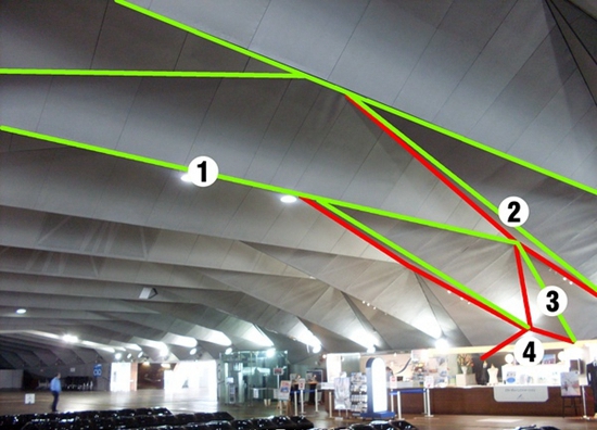 看清楚大概的结构部分的分布,注意一下结构脊线的分布,也就是每两块三角形的相接线。1,2,3,4四个部分,向上的脊线我用红色表示,向下的脊线我用绿色表示。注意一点,1号部分的下脊线是和地面平行的,因为透视,这点很难从图上看出来。