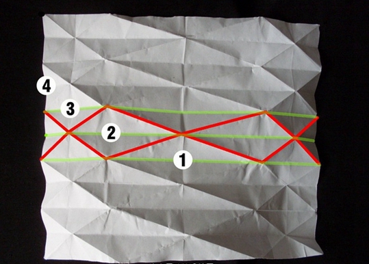 我将我折好的结构重新拆开,并用颜色表示上脊线和下脊线的位置。这里最好用直尺和锐物将这些线所在的地方作上刻槽标记,以方便下一步的折叠。
