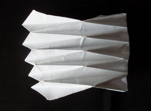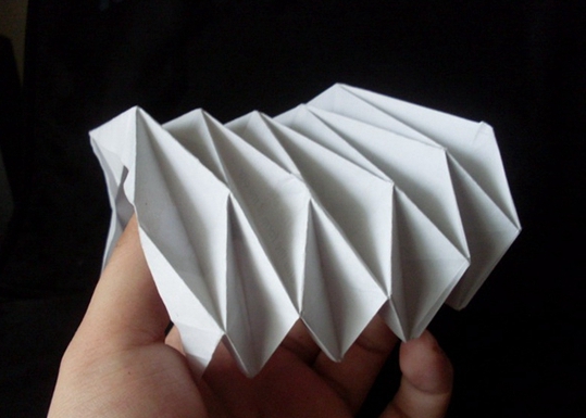 最关键的一步,也正是这一步,你会发现这个结构是多么奇妙。那就是,这个结构其实我们说是折叠出来的并不准确,因为无法折叠,而是需要挤压。这是一个牵一发动全身的结构,一个整体性极高的结构,你必须尽量,同时的,将所有已经标记出来的下脊线相下挤压,上脊线向上挤压!功败垂成,在此一举。