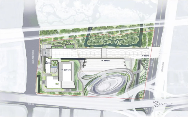 作为火车站区域整体复兴计划的一部分,周边分布湿地博物馆、湿地公园、五星级酒店、国际会议中心等业态。铁道公园作为连接器,将各个功能块紧密联系,形成一条步行景观轴线。