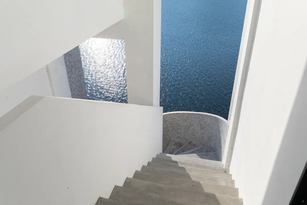 改造保留了原有水库管理功能,将一层大部分空间开放为游客休息区、茶咖空间,并加建三层作为湖景茶室。设计引入福鼎白茶质朴的美学理念,以朴素材料和简洁语言打造禅意空间。一层通过大玻璃门和落地窗引导人走向湖水,亲水平台跨越芦苇丛让人近距离接触水面;二层楼梯岔出空中看台,180度拥抱湖景;三层采用半拱剖面削弱体量压迫感。正对游客的立面上,二层回收瓦片墙在遮蔽办公走廊的同时保证采光通风,纹理与波光粼粼的湖水相呼应。整个项目将基础设施与公共服务有机融合,让游客从走马观花中停下来,与湖景发生真实互动。