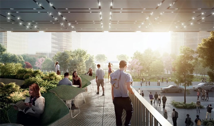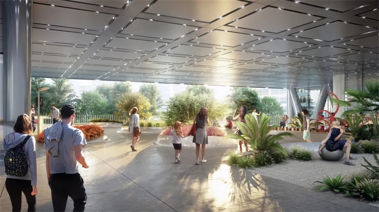 首层地面层在裙楼体量抬高架空后形成整体的城市公共广场空间,将东侧的公共绿地进一步延伸到场地内。