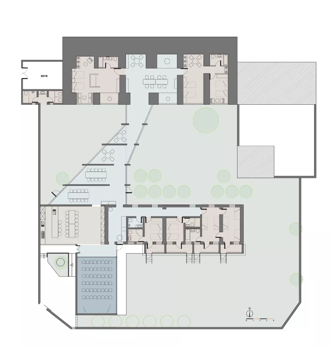 建筑空间主要配置包括:二十余人床位,六个卫生间,五六十人讲堂,四十余人休闲座位。一个双面开放式厨房,一处窑洞小客厅。如此一来,这样一个内部联通的多功能空间,即可欣赏四季,又不受季节冷暖的限制,室内满铺舒适的地暖,漫长冬季也可营业。