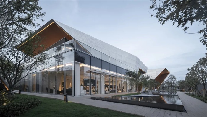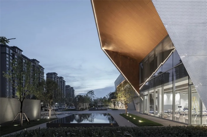 用横明竖隐玻璃幕墙轻轻包裹的一层,模糊的室内外界面,使其尽可能地给予周边环境更多的光感,保证通透的视野。并在入口、转角处采用了不同的几何形状和尺度创建引人入胜的建筑。
