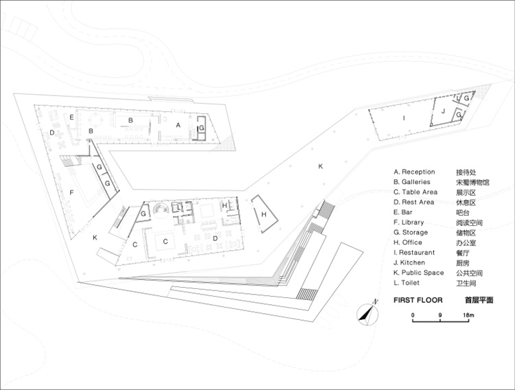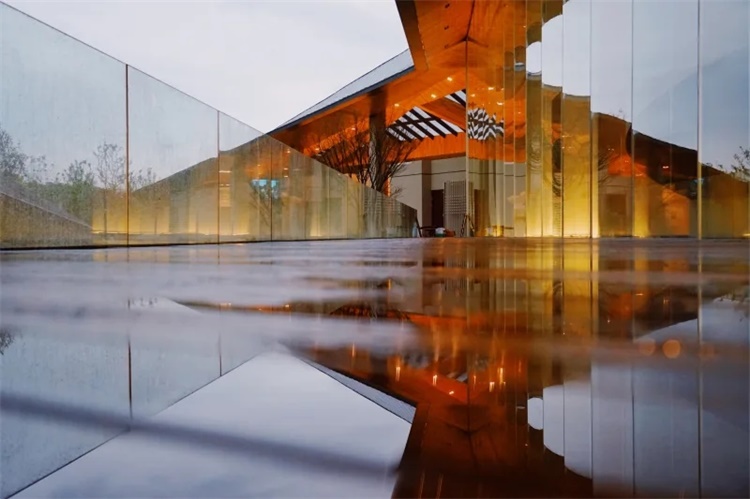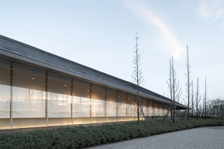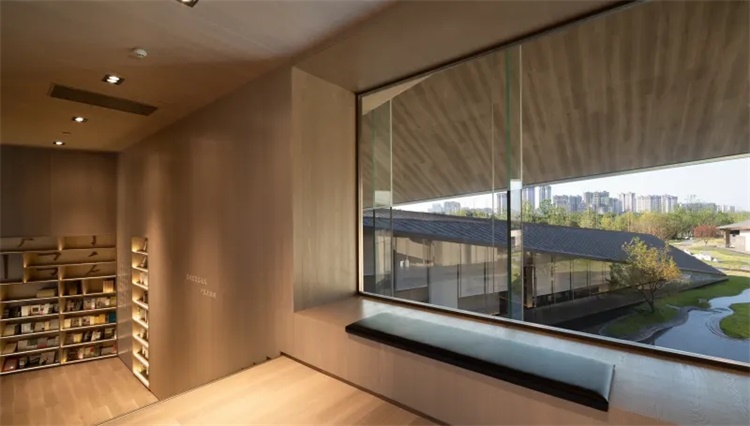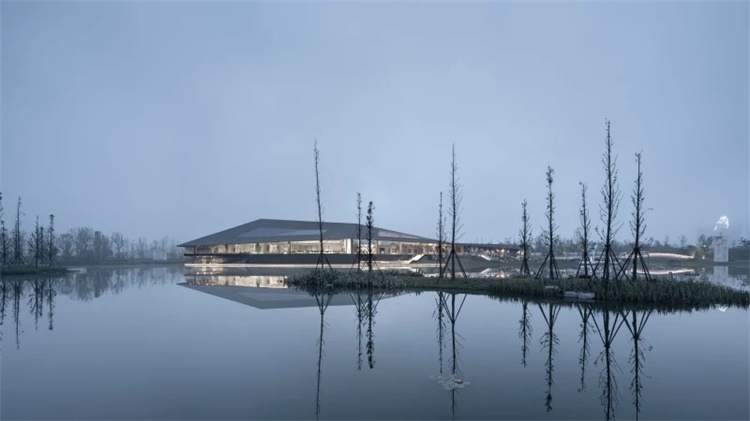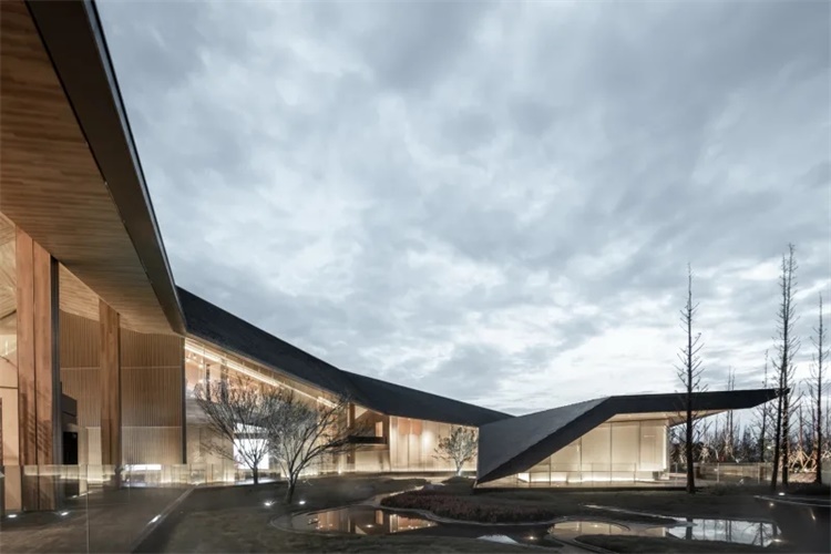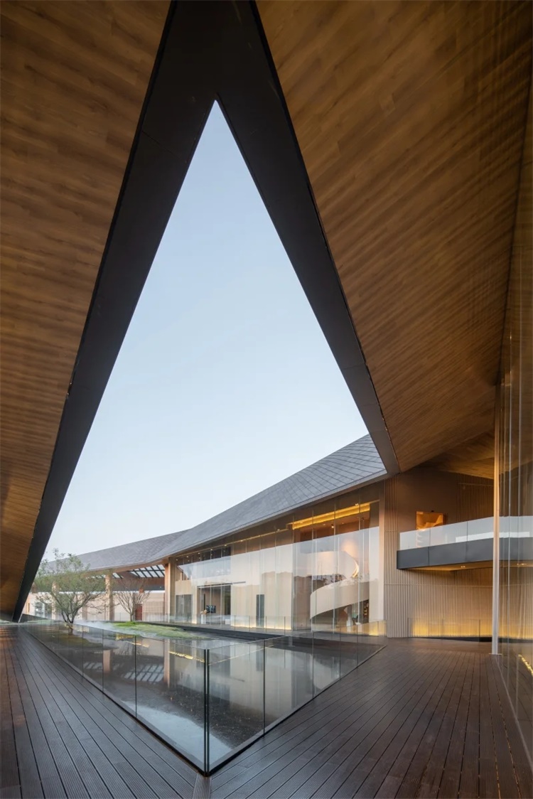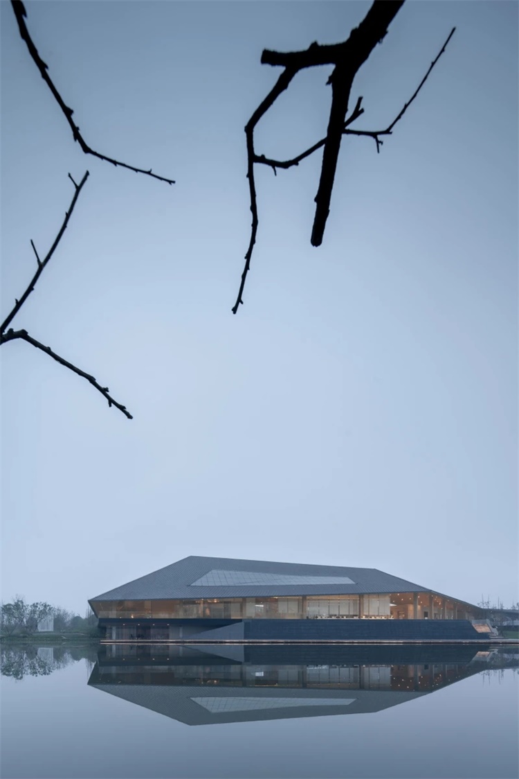 在为书院开发设计时,XAA试图通过寻找一种坚固的山脉形式来让人们了解文学之神。屋顶不仅为建筑提供了鲜明的特色,而且在室内和室外之间形成了过渡空间,这要归功于深处的垂悬点延伸到地面。大型天窗和周围的玻璃幕墙也使自然光涌入整个室内。此外,由于玻璃幕墙的使用,建筑如同漂浮在湖面之上。