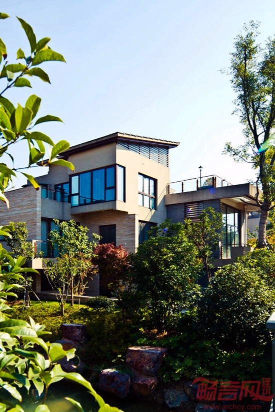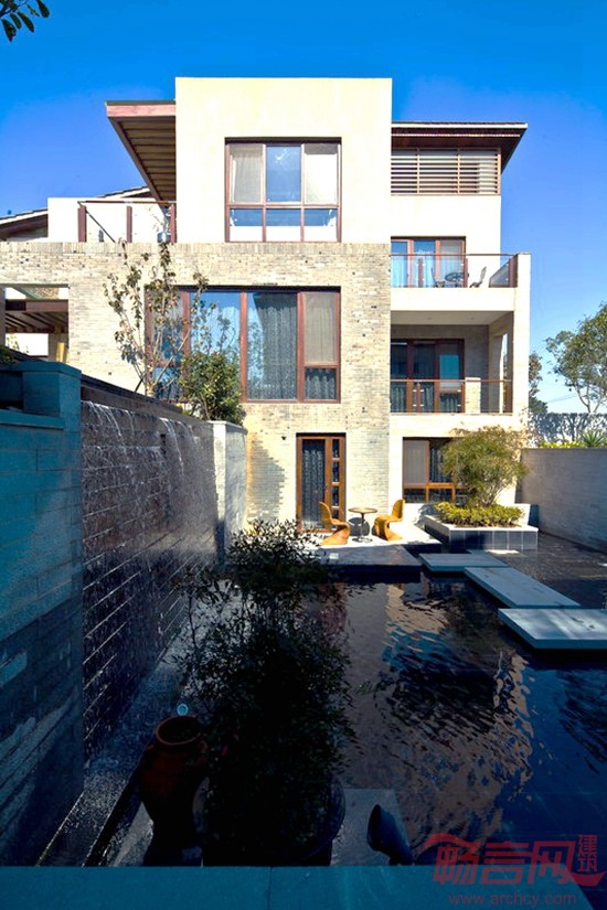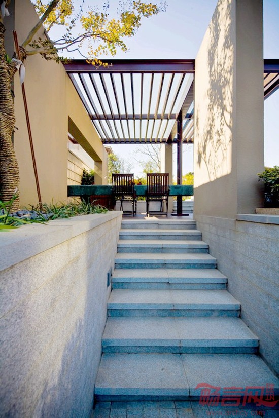 为了充分利用用地水系,在设计中将别墅底层结合水溪设计为步出式地下室,与下沉庭院形成亲水景观,从而使一层私家院落景观、建筑外廊、室内空间层层递进,空间可分可合,充分感受私密休闲的生活氛围;且在二层空中露台结合绿化景观充分融入高尔夫球场及太湖优美的自然风光。这种多重综合的院落体验,将室内外功能和谐融合,入户前院、中院、侧院(下沉庭院)、后院划分出不同的空间氛围,多重空间层次,达到移步换景、步移景异的景观效果。