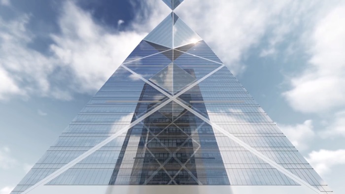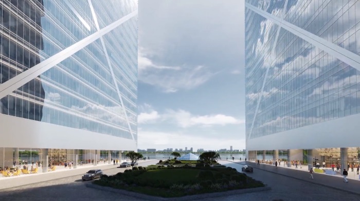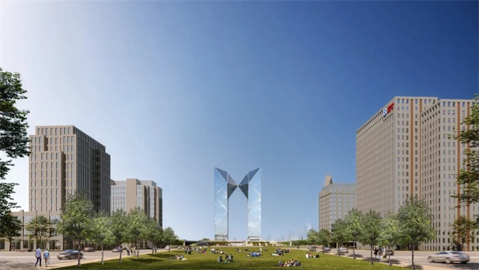 从形态看,两座双子塔楼上部锥形体彼此相连,呈“1”的造型相向而立,寓意在“两个一百年”交汇的重要时刻,不忘初心铸就“时代之门,璀璨之珠”的建筑意向,向时代致敬;建筑效果晶莹剔透,璀璨之珠光芒四射,以融合临港新片区和滴水湖在内的城市、湖光、水岸为画卷,形成迈向世界、开放共赢的国门封面,聚焦东方文明之光,也寓意临港将走向世界,照亮未来。