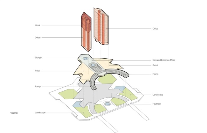 同时,由于整个项目位于从上海市区和浦东机场到滴水湖区域的林荫大道的尽端,为延伸这条重要的视觉轴线,建筑整体造型设计为两栋造型协调优美的塔楼,平面上呈60度角的平行四边形,在塔楼顶部各有一个旋转错位的四角锥体,两者的端点轻巧相连。精巧的连接形成一个拱门形状,将观者的视线引向整组建筑的中心位置。