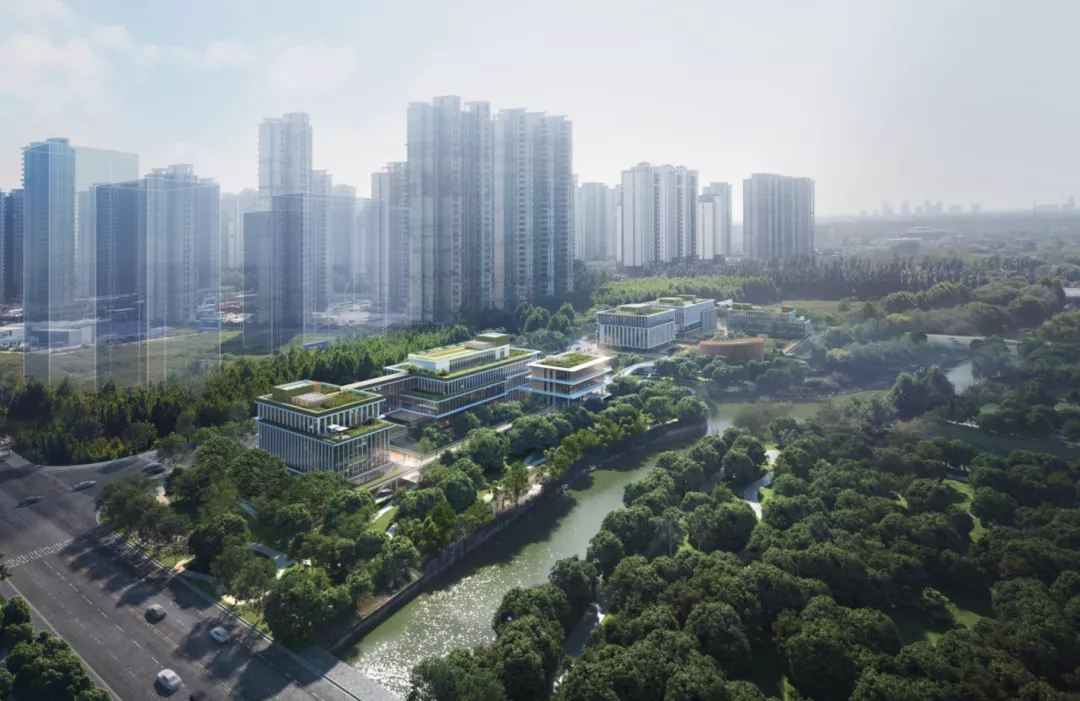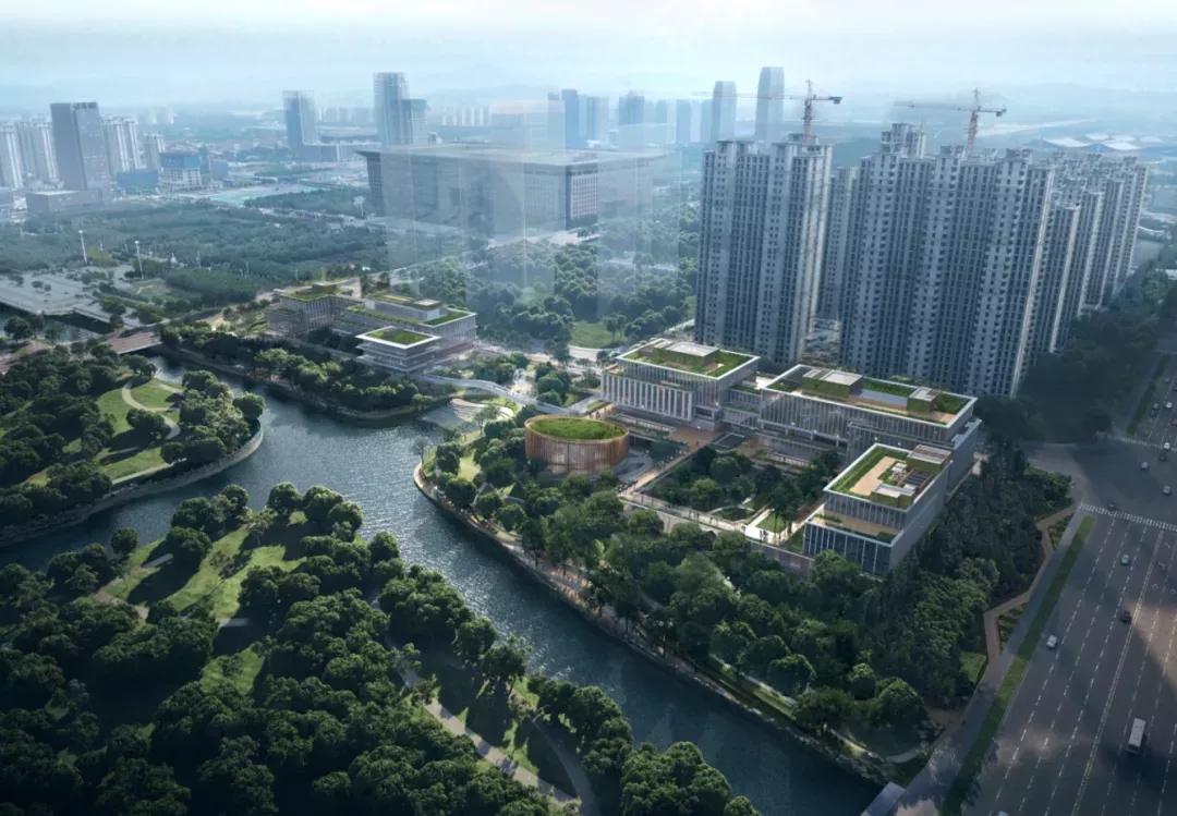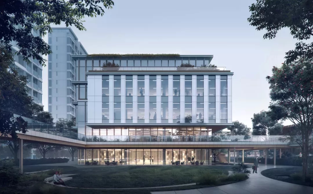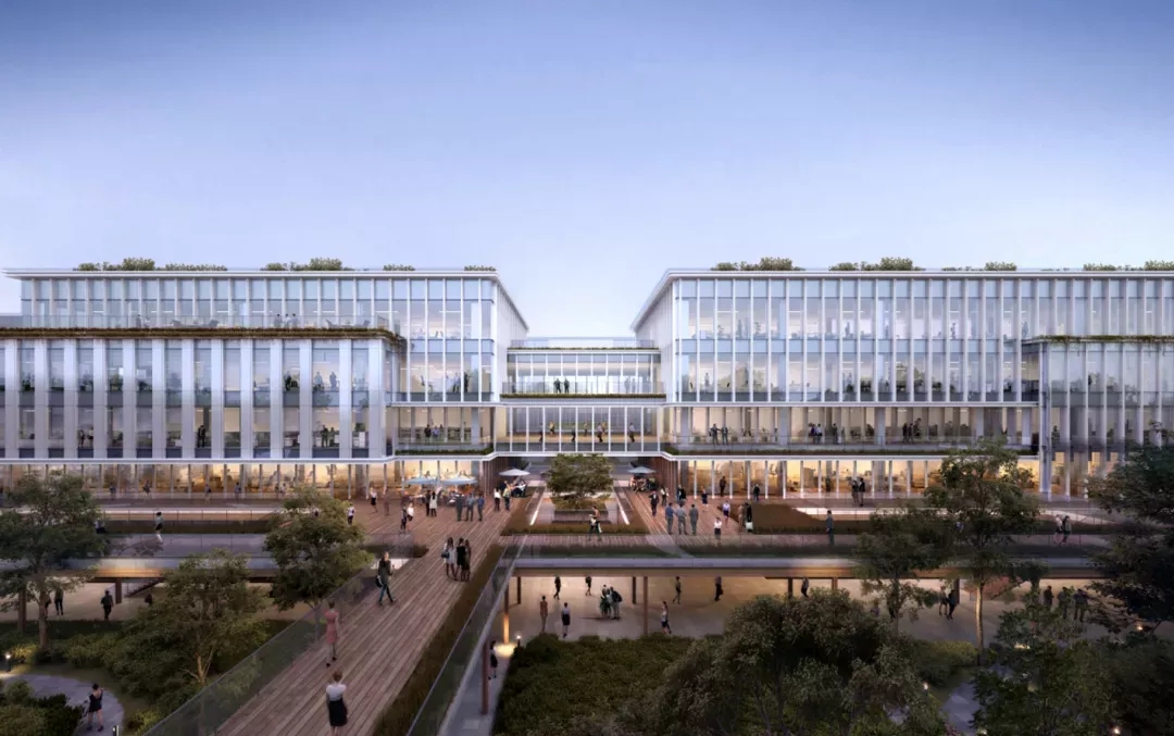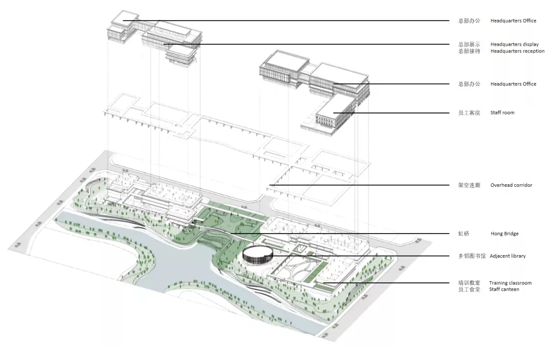 建筑包含办公、员工中心、企业文化展馆等基础功能。同时还设有开放的乡邻图书馆和景观连桥激活滨水界面,增强区域活力。