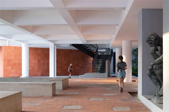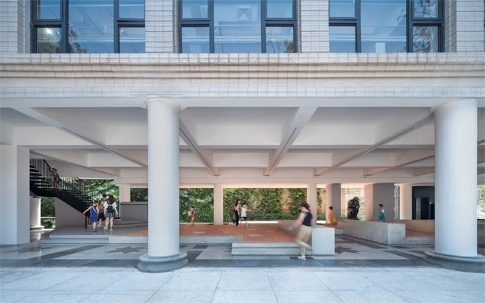 这样的选址面临着另一个挑战:主体空间位于校园腹部,改造难度在于如何形成一个有趣的空间序列,把人流从前广场引导而来,把现有校园零散、不统一的部件,组成一个有机的体系,串联梳理出完整的空间叙事。这个叙事在两个方面展开:一方面变成源头活水,让游客在园区里的动线流动起来,形成内循环;另一方面利用边界区位,把外部的区域动线活络起来,形成外循环。这种把小项目往区域环境放大的设计立足点,也是URBANUS都市实践最基本的解题方式。