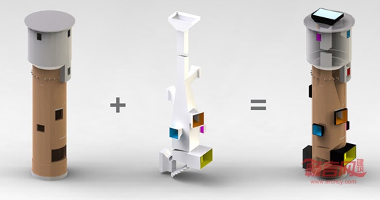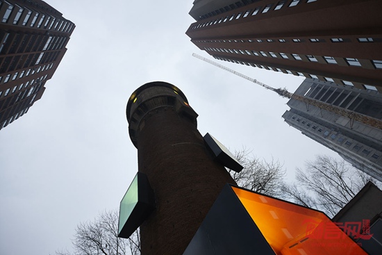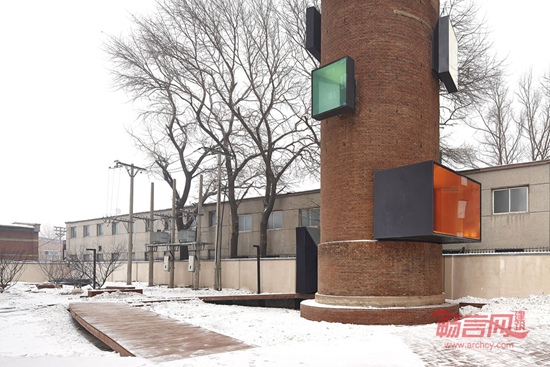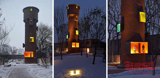 代表新现实的装置以钢板和玻璃构成,明确的几何形体以及醒目的色彩使之与饱经历史的斑驳的旧砖墙形成充满张力的对比,对现实与历史之间的差异构成一种特定的表达。每到夜晚,厚重的水塔渐渐在黑暗中隐去,而明亮的发光体将成为漂浮在空中的鲜明信号……透过这个水塔的改造,我们提出询问,将如何看待这段历史?又如何理解变革的现实?