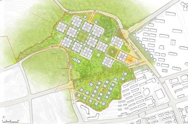 校园分为两个地块。教学科研区包含十栋实验室与办公建筑,中央设置“学术共享空间”作为组织枢纽。文化与公共功能沿城市界面布置,礼堂、体育中心与图书馆向公众开放。居住生活区包含23栋建筑,融入自然景观之中。建筑设计高度控制在20米以内,低于森林冠层,强调通透与开放。通过架空与退让首层空间,减少建筑对地面的占用,使体量仿佛漂浮于林间。每栋建筑均设置光伏屋顶,集中能源中心则提升整体运行效率。