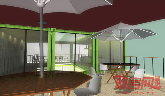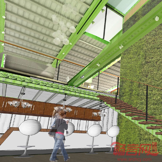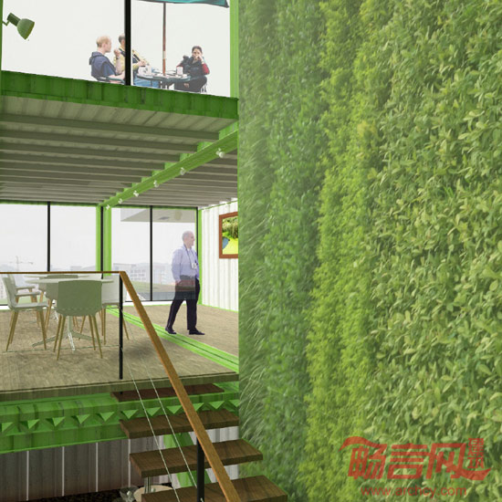 设计在造价可允许的范围内利用集装箱构筑一个临时性的入口作为昭示,利用集装箱特有的快速搭建以及能够回收的特点,结合室内垂直绿化技术的展示,表达出万科对于可持续发展的思考,对环境的关怀,同时新搭建的这个博物馆入口兼具咖啡吧和公共卫生间的功能,为万科架空底层的公共花园提供一个服务配套的场所,一举多得。