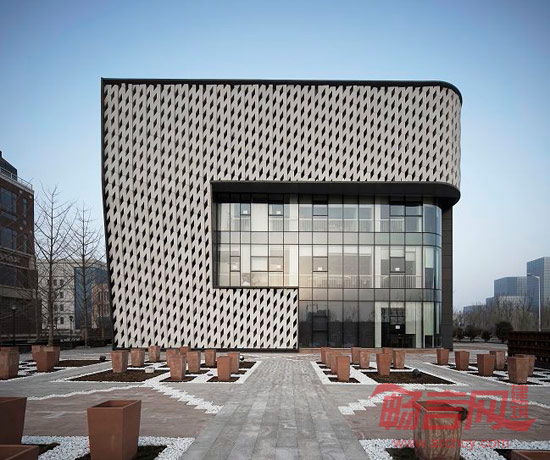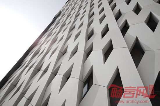 造访者要通过一个空间序列后再看到“盒子”里内容,在这个空间序列中企业的LOGO“MAX”被诠释成为建筑经验中的材质、形体和空间:立面的外挂构件为“M”, 门厅的前台为“A”, 沙盘四周的地面延伸到墙面成为“X”。外立面设计试图表达意外性:一种对严谨的方盒子的消解,对理性的层板梁结构的消解。“M”组成的格栅以及带有“M”图案的打孔金属板为外立面增添了精致和细腻,使建筑对人产生的亲和力。每一块“M”都是由GRC板浇筑而成。四个“M”成一组在立面上进行重复,形成富有立体感的镂空层,使建筑内部通风透气,外部呈现出光影的变化。