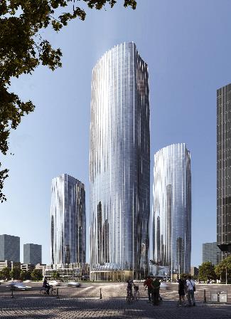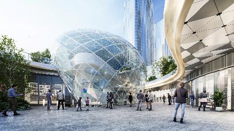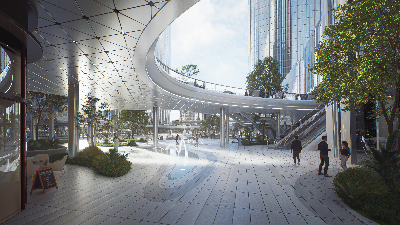 设计构建出多层次的公共空间与绿化环境,将充满活力的综合体打造成为多孔通透的城市枢纽,以适应城市的快速发展。流畅的建筑造型自然延伸至充满绿意的裙楼,形成自然友好的公共空间,促进交流,激活活力。