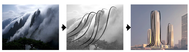 在总体规划中,团队整合不同功能业态和出入口,将行人引向中心的下沉式广场,形成向心聚拢的布局,寓意“藏风纳气”。建筑设计以“云瀑”为灵感,抽象凝练九天银河倾泻而下的动态之美,将其融入建筑形态,以简洁而流畅的立面线条,营造出极富流动感的立面形象。