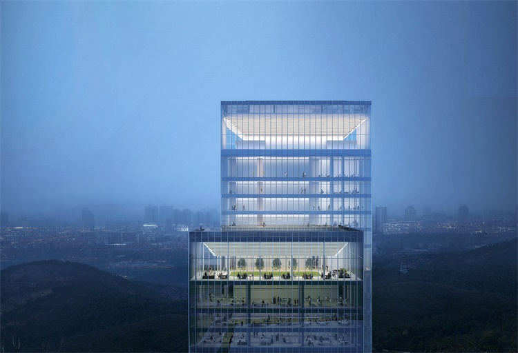 “幕墙不仅是建筑轮廓的勾勒,也是对内部空间进行雕塑和保护。”设计师韦业启在塔冠巧妙地使用幕墙语言,以透明的玻璃幕墙配合灯光照明表达“光之谷”的概念,既与整体设计呼应统一,又与塔身办公区域进行了功能区分示意,同时也将预留机房、擦窗机等基础设施集中安置在主冠的“谷”中,不影响整体视觉效果,让功能统一纯粹。