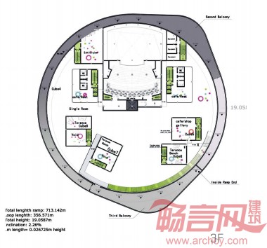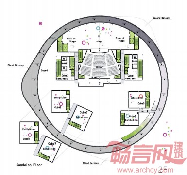 该项目的整体为环形造型,展馆镶嵌在一条600多米的环形坡道内,其空间走向依照时间顺序延伸,观展者可沿此轨迹了解大运河自古至今的变化和发展。坡道环绕着一个个由立方“村落”围成的中庭。设计者将运河之水引入建筑内部,并将环形建筑和立方体村落半悬于运河之上,营造了整体的运河氛围。