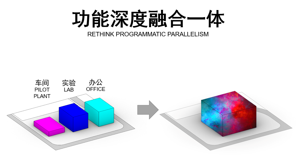 设计将高六层的实验办公楼置于南侧,尽览中央公园的绿色景观,高两层的中试车间置于北侧,便于货流进出,两者之间通过集中中庭连接,形成风车状南高北低的建筑轮廓。设计在屋顶中央设置了半浮于屋顶斜面的方形采光顶,打破规整的建筑体量,提升室内采光。独特的轮廓结合格条状的ETFE膜材质,模拟即将融化的方糖,晶莹剔透,若隐若现,以此暗喻项目将知识、资源、人才的四方荟萃。