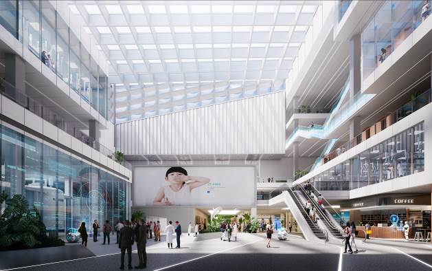 设计注重绿色生态环境的营造,将场地景观从建筑中庭向四周发展延伸。项目西侧通过建筑退让形成展示形象的广场空间,未来也可开展大型接待活动;项目东侧为城市景观轴线,与中庭东侧入口无缝衔接;项目南侧为城市公共绿地,通过景观布置,为员工营造出静谧的休闲及活动空间。