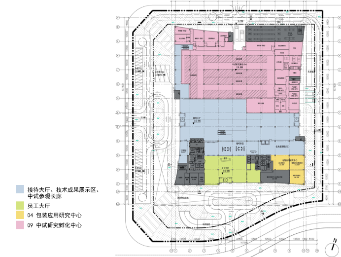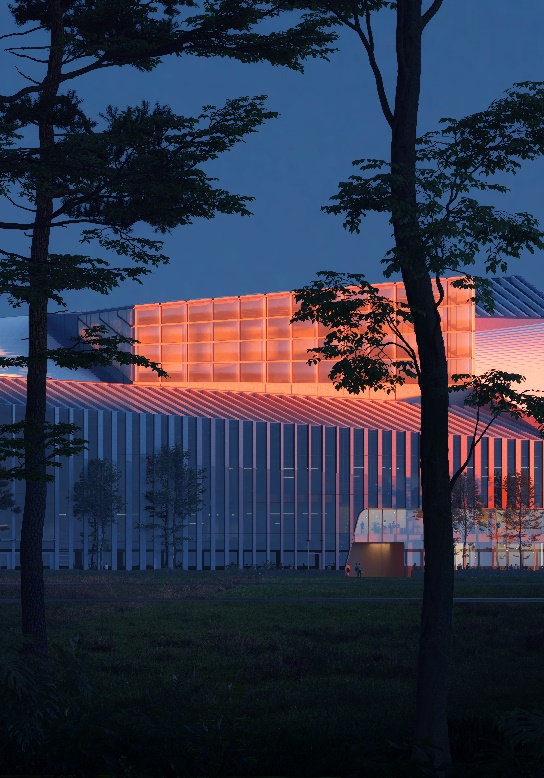 项目位于呼和浩特伊利现代智慧健康谷中轴西侧,与伊利总部共同构成片区的中轴门户,东侧紧邻城市绿地,南侧面向中央公园,地理位置和景观资源优越。设计需在有限的地块内,容纳包括实验室、办公空间、多功能厅、中试车间及展示空间在内的多元空间,并根据员工、政府、专家、游客的不同需求,规划设计参观流线,确保各功能相对独立互不干扰。