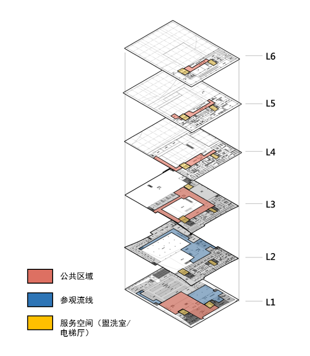 内部空间采用高效紧凑的布局,通过挑高的中庭串联起各功能空间,营造出具有视觉冲击力的抵达体验,并在首层打造了两个接待大堂,以确保员工以及各类访客便捷可达且动线互不干扰。南侧为员工大堂,可由此通过东西两侧的电梯直达实验办公区域;西侧为接待大堂,访客在中庭大屏幕观看介绍之后,可由此进入参观走廊,通过走廊末端的扶梯进入上层空间,整体参观路线精心设计空间节奏,营造观感沉浸的游览体验。此外,设计为不同的货物及垃圾运送各自打造了三条动线。为营造出轻松宜人的科研办公环境,设计结合中庭楼梯打造了丰富的社交空间,在必要时可灵活转换为临时办公空间,满足弹性发展需求。
