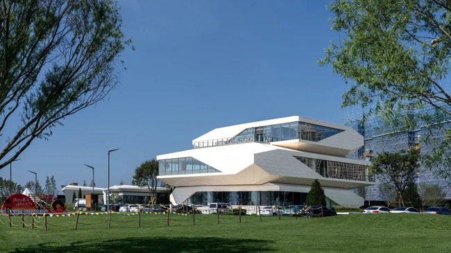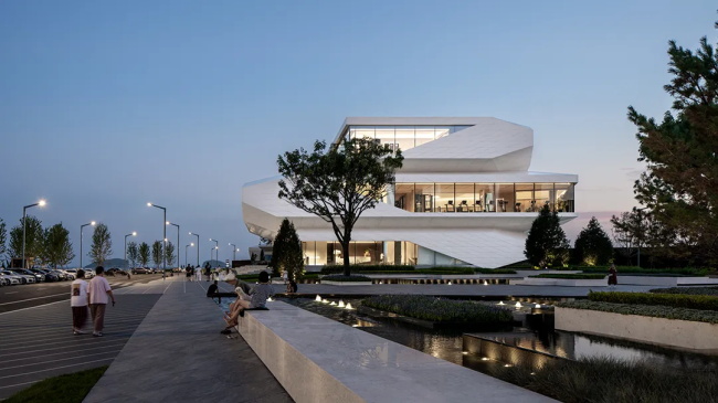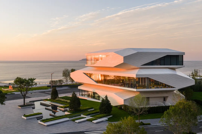 面对大连独特的“山海连城”格局——海中有山,山中有城,边缘保留完整山海界面。设计以“叠石”这一行为原型作为意象基础,利用三块石头堆叠、挤压、碰撞所产生的力学张力,转化为建筑的视觉与空间张力,构成三层体量:一层抬高2米,设置为这一片区所服务的社区会客厅、城市展厅等开放界面;二层为游泳、健身等为邻近社区居民提供运动主题配套,并分别通过立面洞口的几何框景向海岸线不同朝向,打开视野;三层为咖啡、酒吧和餐饮等休闲社交业态,并通过体量的错动所形成的屋顶露台设置了观海的外摆空间。
