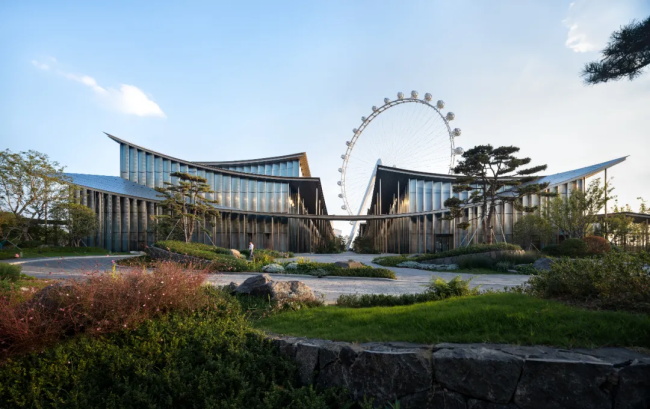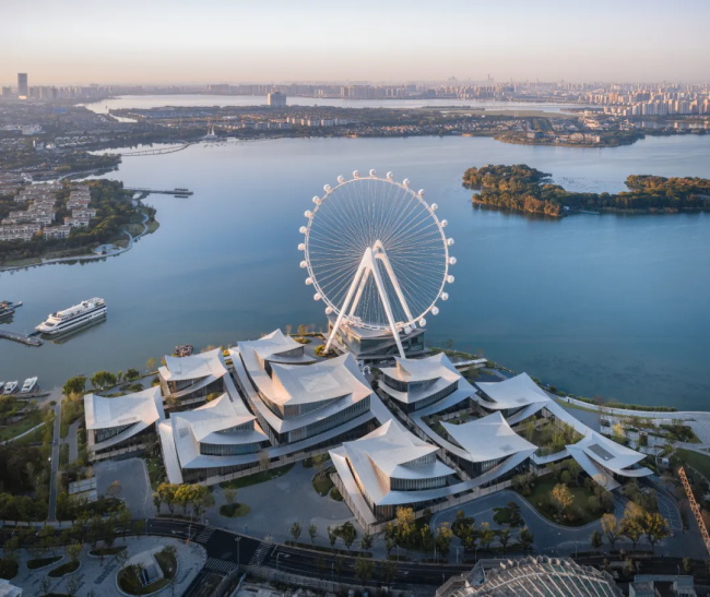 规整的城市肌理与自然蜿蜒的湖岸肌理在美术馆的用地处交汇,同时也是多条城市视线通廊的焦点。丹麦 BIG 建筑事务所充分利用紧贴水岸的绝佳地理优势,基于对苏州园林中“廊”、“亭”、“院”等元素的现代诠释,以分散体量沟通城市视线通廊,在城市与滨水之间,构建了一座“无边界的美术馆”。建筑布局与城市街道成一定夹角,自然形成不同尺度的户外开放空间。通透的有顶廊道引导访客在美术馆场域自由穿行,直至金鸡湖水岸并嵌入环湖滨水开放空间系统之中,带领观众踏上一场城市、自然与水域交融的艺术旅程。
