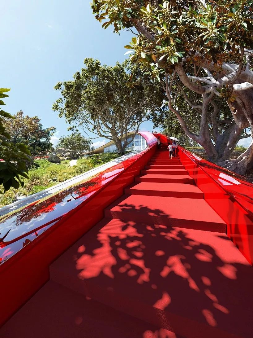 “智慧之环”通过一个独立的结构,将两个场地连接在一起,形成一条与自然环境和谐共存的红色丝带。“山顶是展览中心,客人可以在这里参加科技和文化活动,同时欣赏总体规划的全景,”power company解释说。“第二个项目是接待中心,在那里展示着总体规划的模型。