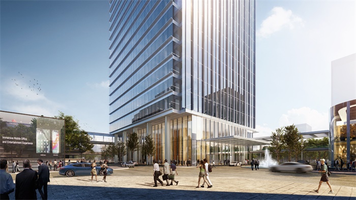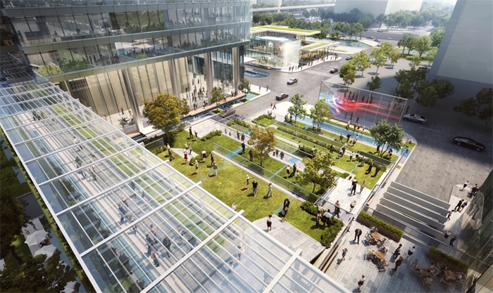 连接天桥设置在二楼,最大限度地提高了每个区域的连接和交互。项目中引入充分的绿色空间,并设有屋顶花园、绿化平台和绿色人行道,围绕地块周围提供友好的工作环境,并增加与公众的互动。