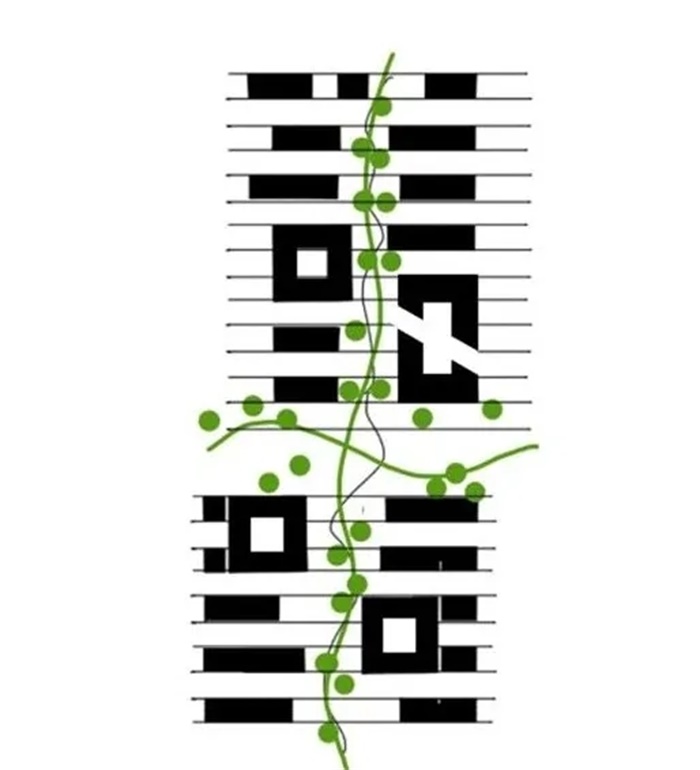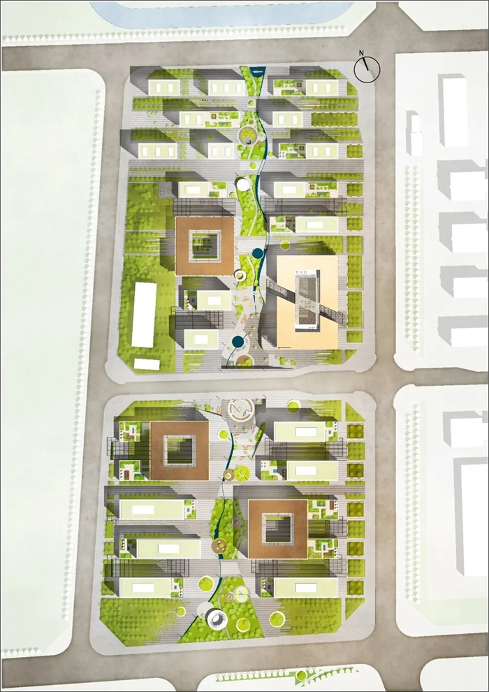 设计引入一条南北贯穿的蜿蜒“绿脊”作为共享空间,连接所有设施与服务,如餐厅,商业,科技服务等。北侧的居住功能和南侧的办公功能分居“绿脊”两端,既确保清晰的功能分区,又能在空间上相互融合借用。中央部分自然沉至地下一层,结合商业配套空间,无缝衔接南北地块。遵循外车辆、内行人的原则,确保了中央“绿脊”成为纯粹不受干扰的绿色慢行空间。这条“绿脊”犹如北京传统城市格局中的主巷,串联起两侧的“胡同”街道及中庭空间,形成有主有次的空间层次感。既有宽阔疏朗的景观步道,也有亲切宜人的小尺度场所。