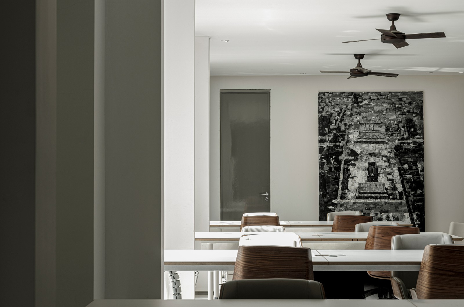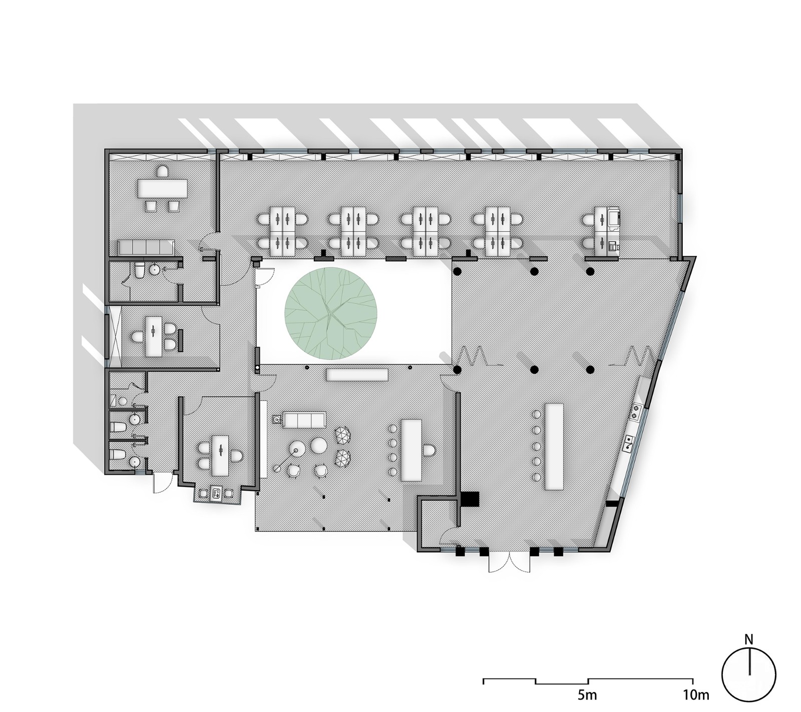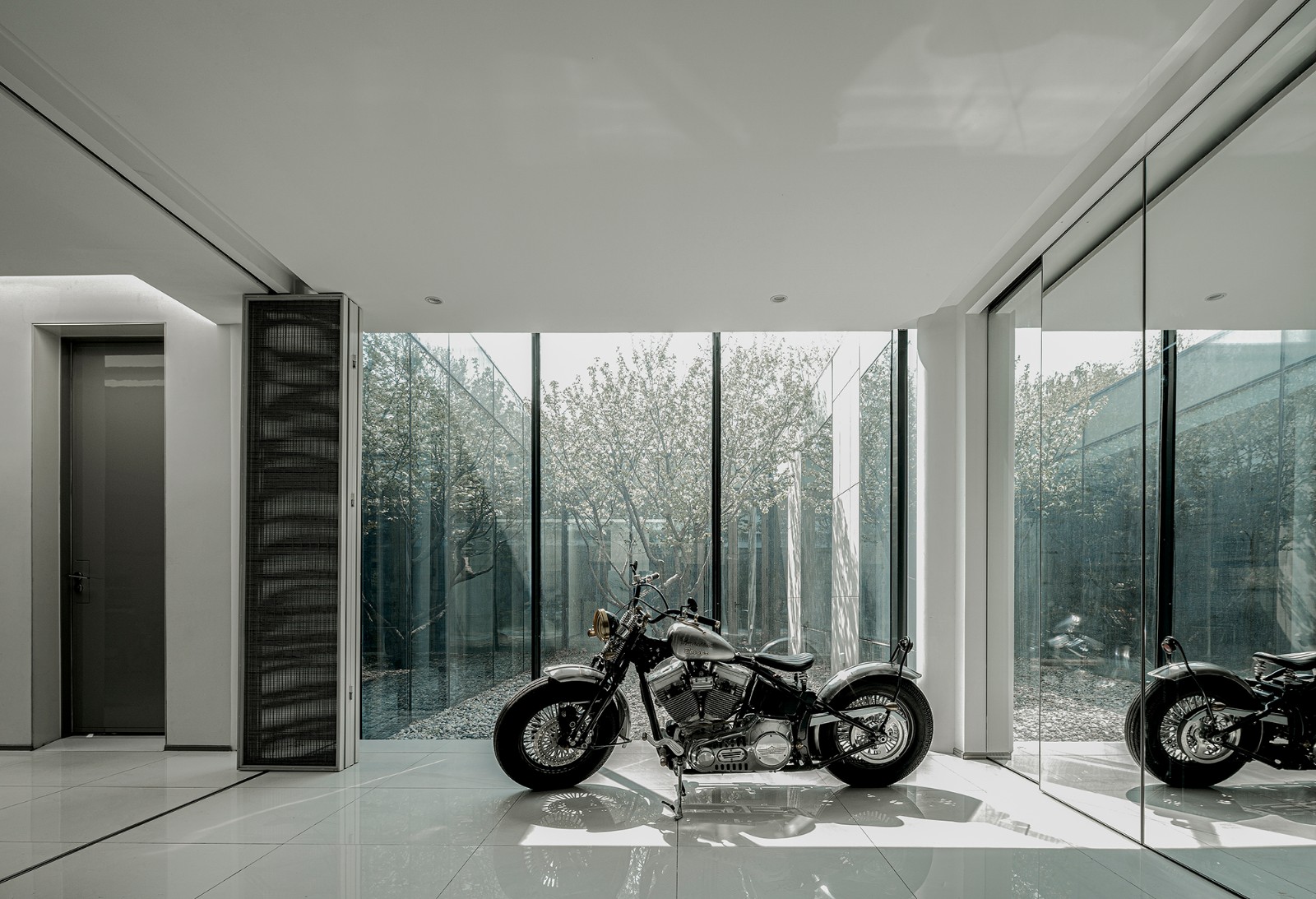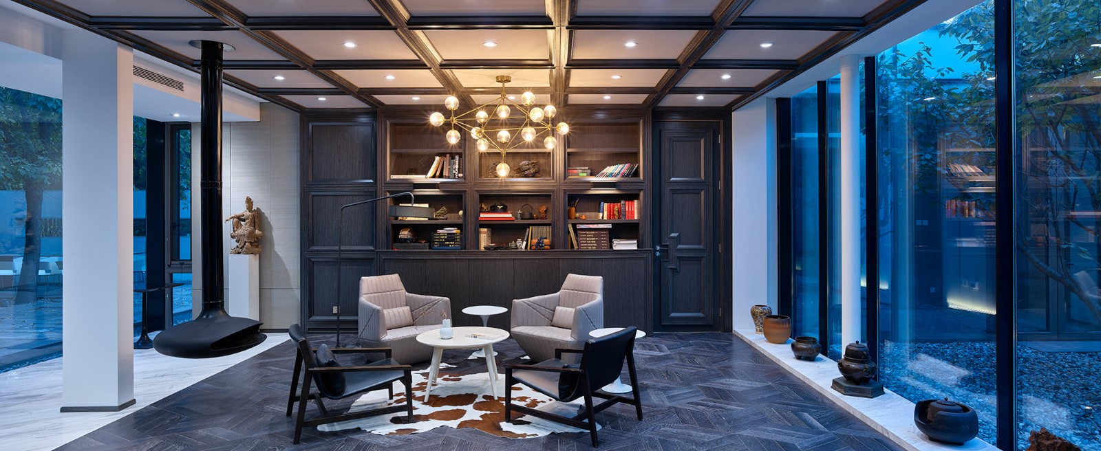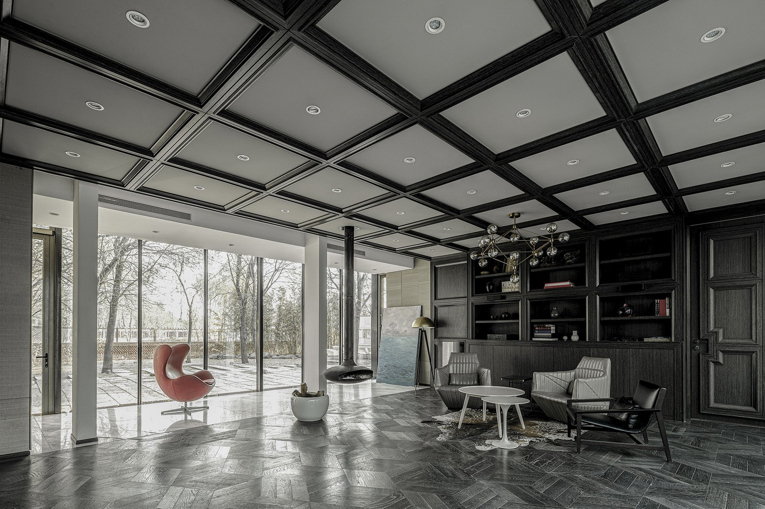 项目的功能定位为设计工作室,根据设计师日常的生活及工作需求,在空间布局上设定四个板块区域。进 门前厅可以满足用餐、水吧、会议等公共交流功能,与旁边的健身区通过拉门灵活分隔、合并,满足举办艺术沙龙活动和展示的功能;西侧 VIP 休闲交流区在南北两侧设有全景落地玻璃幕墙,成为一个闲适的 会友交谈区域;北侧的办公区域则实现团队工作的场地功能。
