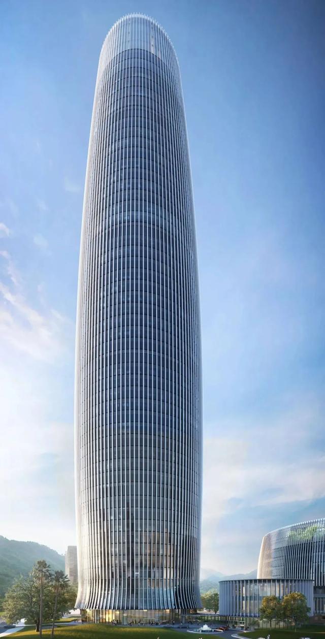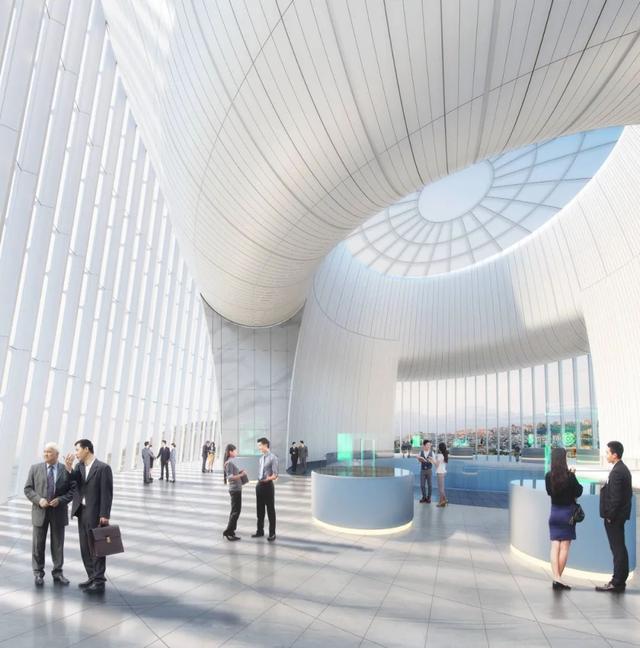 办公塔楼的塔冠部分是设计别出心裁的“天空大堂”。塔冠整体落在混凝土剪力墙上,结构与建筑相融合最大限度实现了优雅的曲面设计。