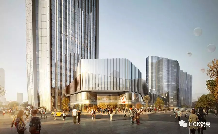 在建筑外立面的处理上,HOK以波光粼粼的湖面为灵感,将这光与影的交错重现在塔楼立面上。优雅的波纹从塔冠处缓缓流淌,以波浪肋的形式出现在塔身立面上,金属的质感在阳光下闪耀恰似水面的光辉。灰调的玻璃结合深灰的金属,配以深金色点缀,与色彩规划要求中淡雅温润的暖灰、黄灰完美契合。竖向的语汇令塔身显得流畅修长,简洁的商业立面风格大气精致,尽显优雅出众气质,将湖光山色意像寄于玻璃和金属优雅的细节中。