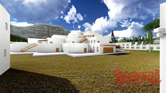 考虑到当地的民居聚落的传统以及本方案的使用性质,我们将规划的意象定位为分散体量形成村落。其中将学校定义为整个区域的精神中心,使主教学楼类似坛城的形制,突出学校教育与宗教的密切关系。主教学楼整个建筑向心布置,围绕着中心展开,逐层退台。坛城的各个屋顶是相互连通的一系列平台,是学生的室外活动空间。层层错落的天窗为教学楼内部提供了充足而且宗教感强烈的光线。