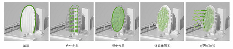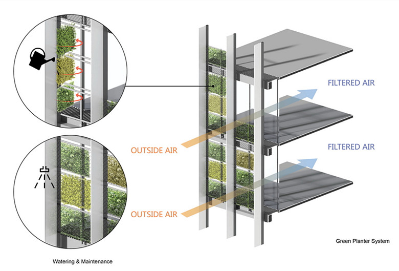 高 70米的植生绿墙,应用了多种方式有效控制建筑热耗,实现低碳节能的设计目标。办公楼设计采用直面玻璃,方便施工。西立面作为「会呼吸的立面」,绿植为室内办公空间提供了有效遮阳,从而降低室内温度,减少冷气和能源的使用;植物同时可将室外空气过滤,令办公大楼内的空间更为清新。