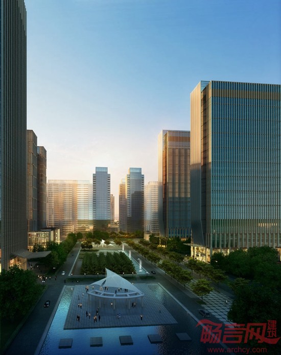 北侧商务区以中央商务公园及下沉广场为核心,呈半围和式布局,保证了采光、通风及景观视线的同时,凸显了商务区的高档品质,超高层办公楼位于基地的东北角,与序列性较强的写字楼和星级酒店相结合,构成了统领性构图要素。