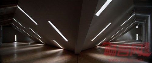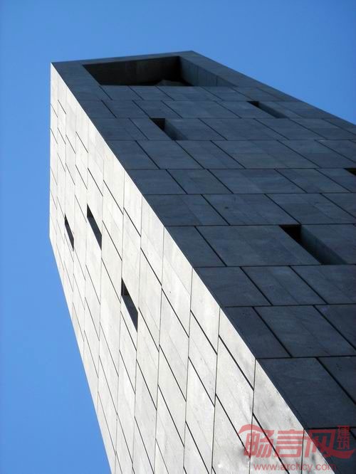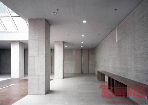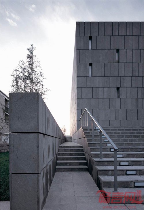 建筑的立面材料采用了极具质感的蓝灰色玄武岩,厚重而肃穆。干挂的玄武岩留缝有两种:2.5cm和0.5cm,对立面设计的完成有更好的表现力。一系列20cm宽的竖向窄条开窗看似随意却又暗藏规律地排列其上,按一定比例系数向高处递增。室内暖色的砂岩分缝与外立面,使用的是同一系统和模数的手法。外墙立面有韵律的分隔手法一直延伸到了室内地面的铺砌。主厅内白色涂料与外立面沉重的色彩形成了对比。