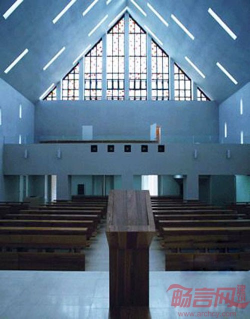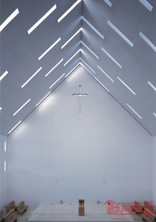 龙山教堂的最初构思基于对现状地块和周边建筑物的理想分析。小镇周边的住宅以联排别墅为主,少量独幢别墅,体量在二、三层,为呼应不远处绵延西山的山形,屋面选择了坡屋面。从小镇的入口远远就能看到教堂的钟塔和上面的空十字架,钟塔位置的确立和高度的选择是在使用现代手法——教堂主体和钟楼分离的同时,兼顾了小镇对中心点和视觉以及听觉中心的需求。设计的挑战之一是创造一个室外的场所“广场”做为教堂活动功能延伸的想法。在基地比较局促的条件下,钟塔、广场、教堂前体量和教堂主题量形成序列;钟塔作为引导和开始,钟塔和教堂之间的广场巧妙地与住宅区相对独立的水景绿带相连,构成隔而不断的景观空间和交通联系。